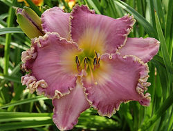 (Bachman, 2001) height 31in (79cm), bloom 7in (18.0cm), season M, Dormant, Diploid, 21 buds, 4 branches, Orchid pink self above chartreuse throat.